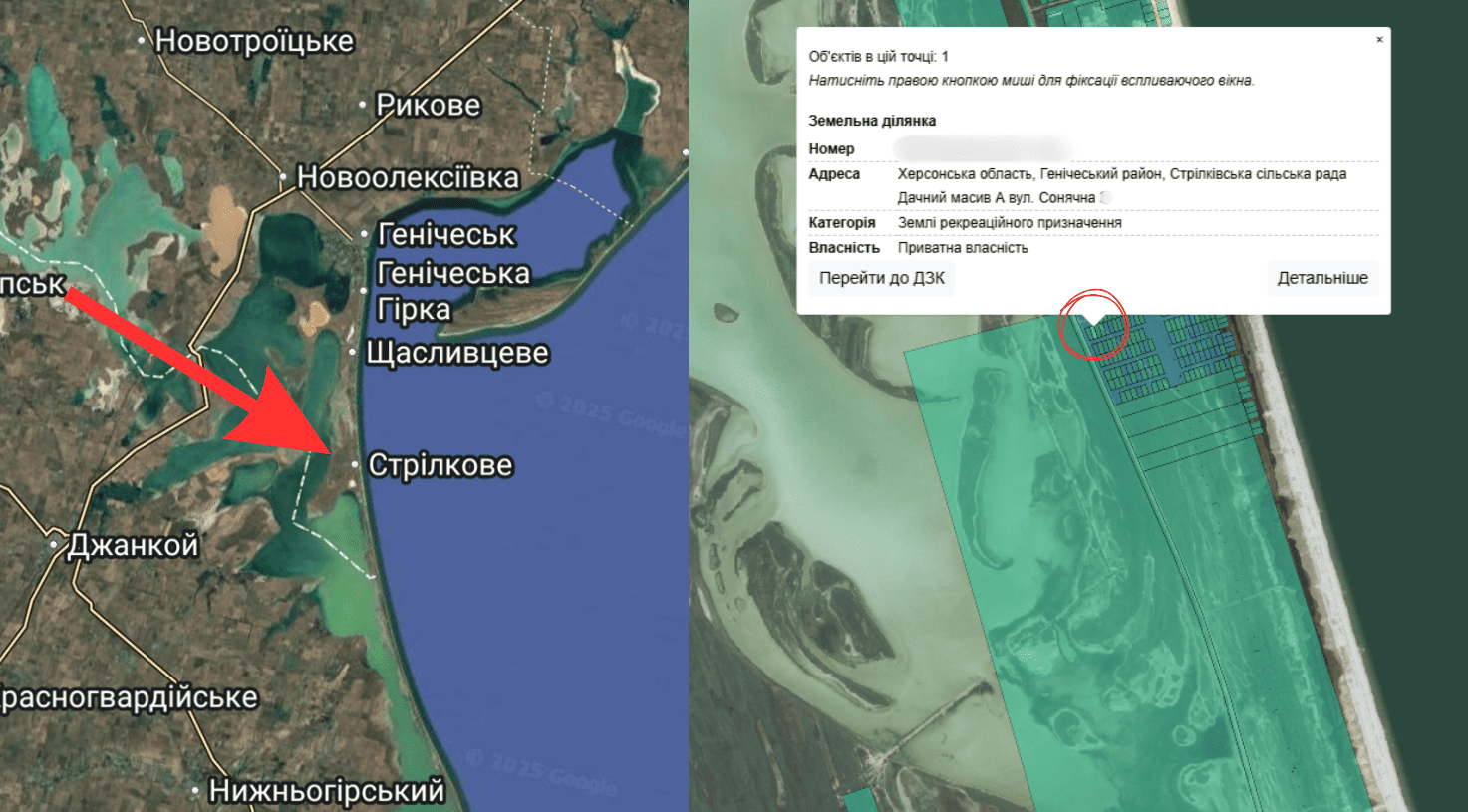 Стрілкове на Херсонщині. Локація земельних ділянок, якими володіють Юрій та Наталя Моделкіни (зараз ця територія окупована РФ)
