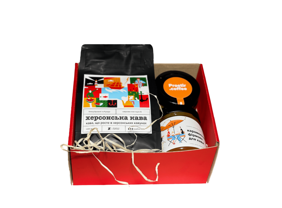 Тут можна купити подарунковий бокс до якого входить херсонська кава, апельсиновий джем та фірмова карамель від Prostir.coffee.