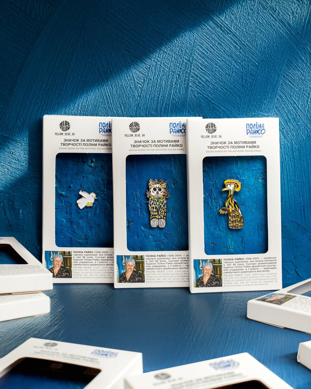 "Леопарди", "Голуб" і "Одуд" – металеві значки бренду INSPIRED BY, змальовані з персонажів Поліни Райко.