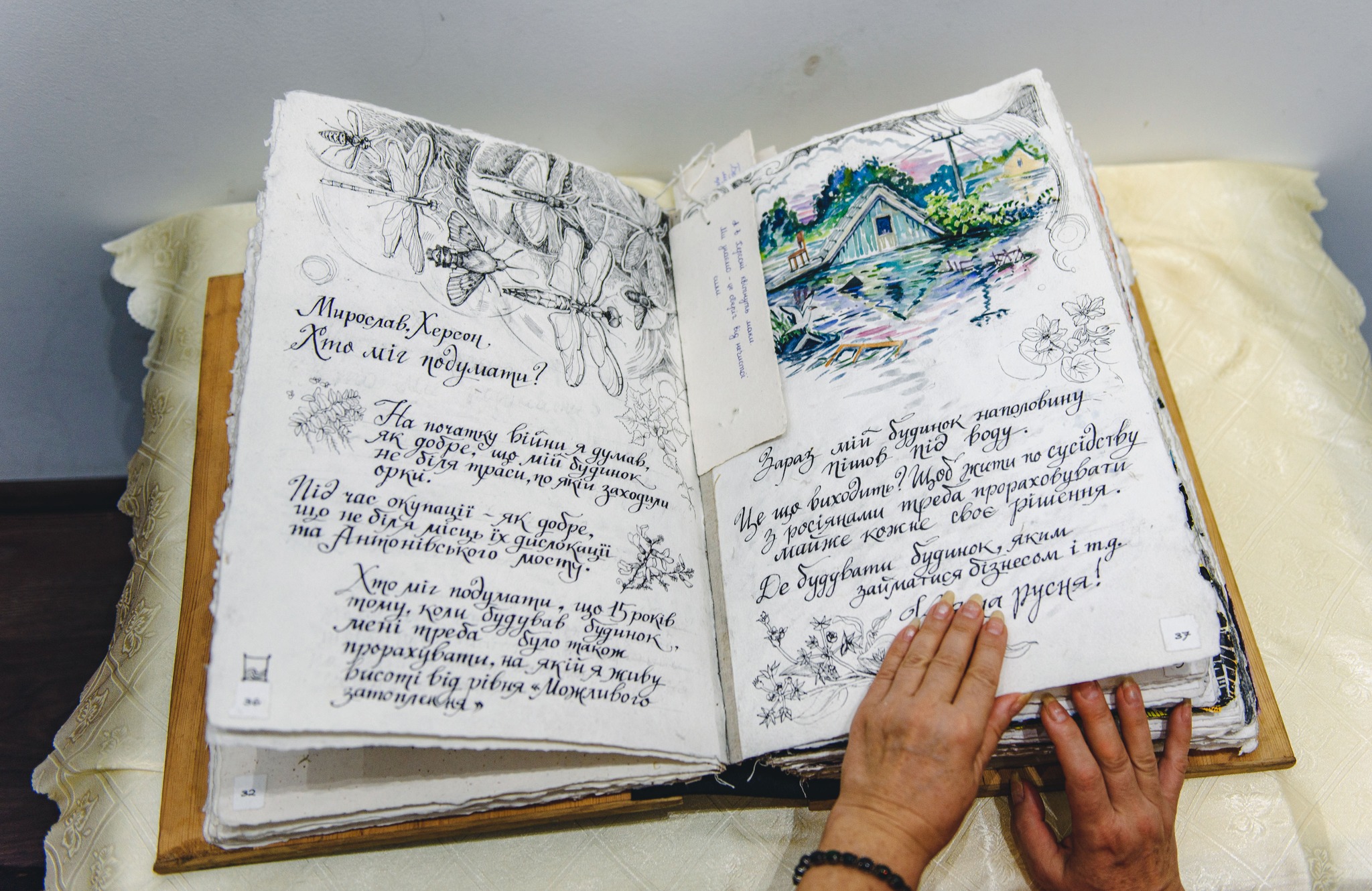 Рукотворна книга Lament of Kherson region існує в єдиному екземплярі. Її обкладинку зробили з дерева й оздобили уламком снаряда з херсонського подвір’я, а папір виготовили вручну.